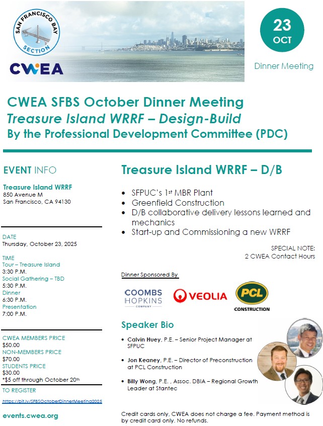 CWEA SFBS October Dinner Meeting and Treasure Island WRRF Tour
