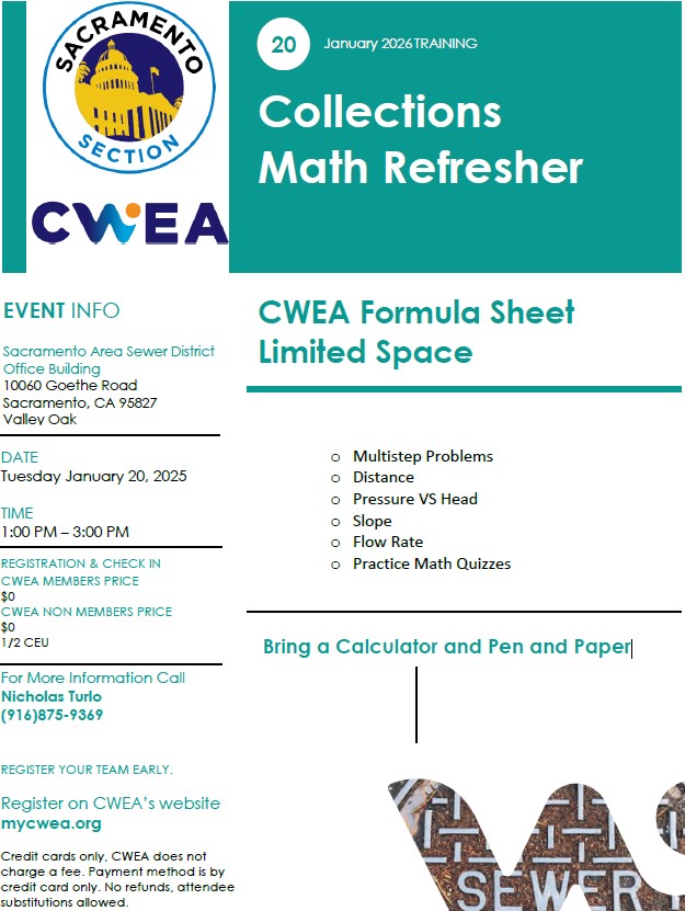 Click Here for Flyer CWEA Formula Sheet- Multistep Problems - Distance - Pressure VS Head - Slope - Flow Rate - Practice Math QuizzesBring a Calculator and Pen and Paper