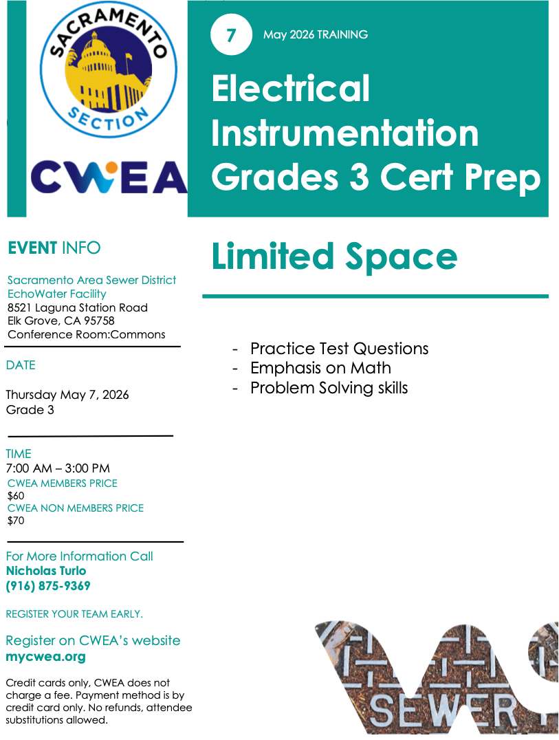 TIME 7:00 AM – 3:00 PMCost:CWEA MEMBERS PRICE $60.00 CWEA NON MEMBERS PRICE$70.00Event Contact:Nick Turlo(916) 875-9369turlon@sacsewer.comTo join our Grades 1 and 2 Cert prep training, register below:https://bit.ly/SASElectricalInstrumentationGrades1and2CertPrep