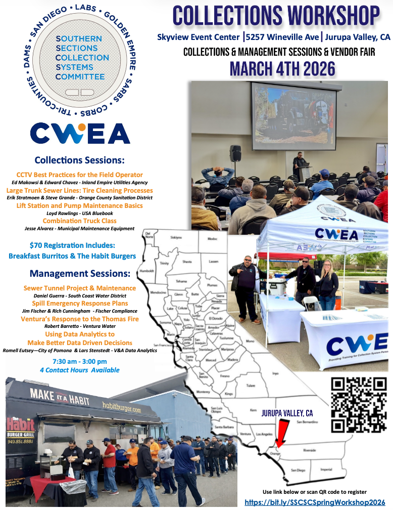 Southern Section Collection Systems Committee (SSCSC) is happy to announce its collection workshop will be held on Wednesday, March 4th, 2026 at the Skyview Events Center in Jurupa Valley.  Click Here for Flyer