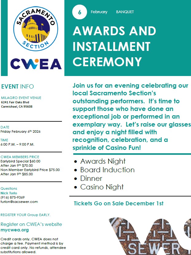 PriceCWEA Member - Earlybird Price $60.00After Jan 9th $70.00 Non-Member - Earlybird Price $75.00 After Jan 9th $85.00Tickets Go on Sale December 1st, 2025!Event Contact:Nick Turlo(916) 875-9369turlon@sacsewer.com