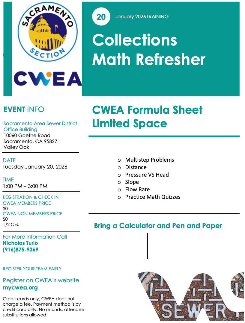 Click Here for Flyer CWEA Formula Sheet- Multistep Problems - Distance - Pressure VS Head - Slope - Flow Rate - Practice Math QuizzesBring a Calculator and Pen and Paper