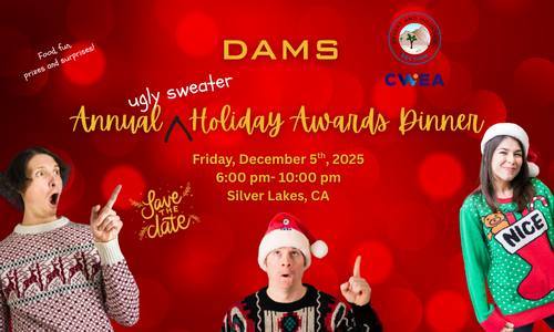 Compete in our Ugly Sweater Contest for fabulous prizes, strike a pose at the festive photo booth, indulge in a delectable cake & sundae bar, and enjoy door prizes that will have you leaving with more than just memories. Your ticket includes a delicious dinner, refreshments, and one drink ticket – perfect for toasting to the exceptional CWEA/DAMS members and professionals who keep our environment safe. Whether you're a seasoned pro in the industry or passionate about environmental sustainability, this gathering is the ideal way to network, celebrate successes, and kick off the holiday season with joy and camaraderie.