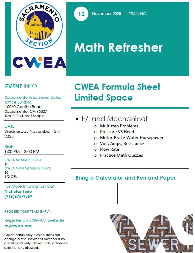 Click Here for FlyerCWEA Formula Sheet- E/I and Mechanical - Multistep Problems - Pressure VS Head - Motor-Brake-Water Horsepower - Volt, Amps, Resistance - Flow Rate- Practice Math Quizzes